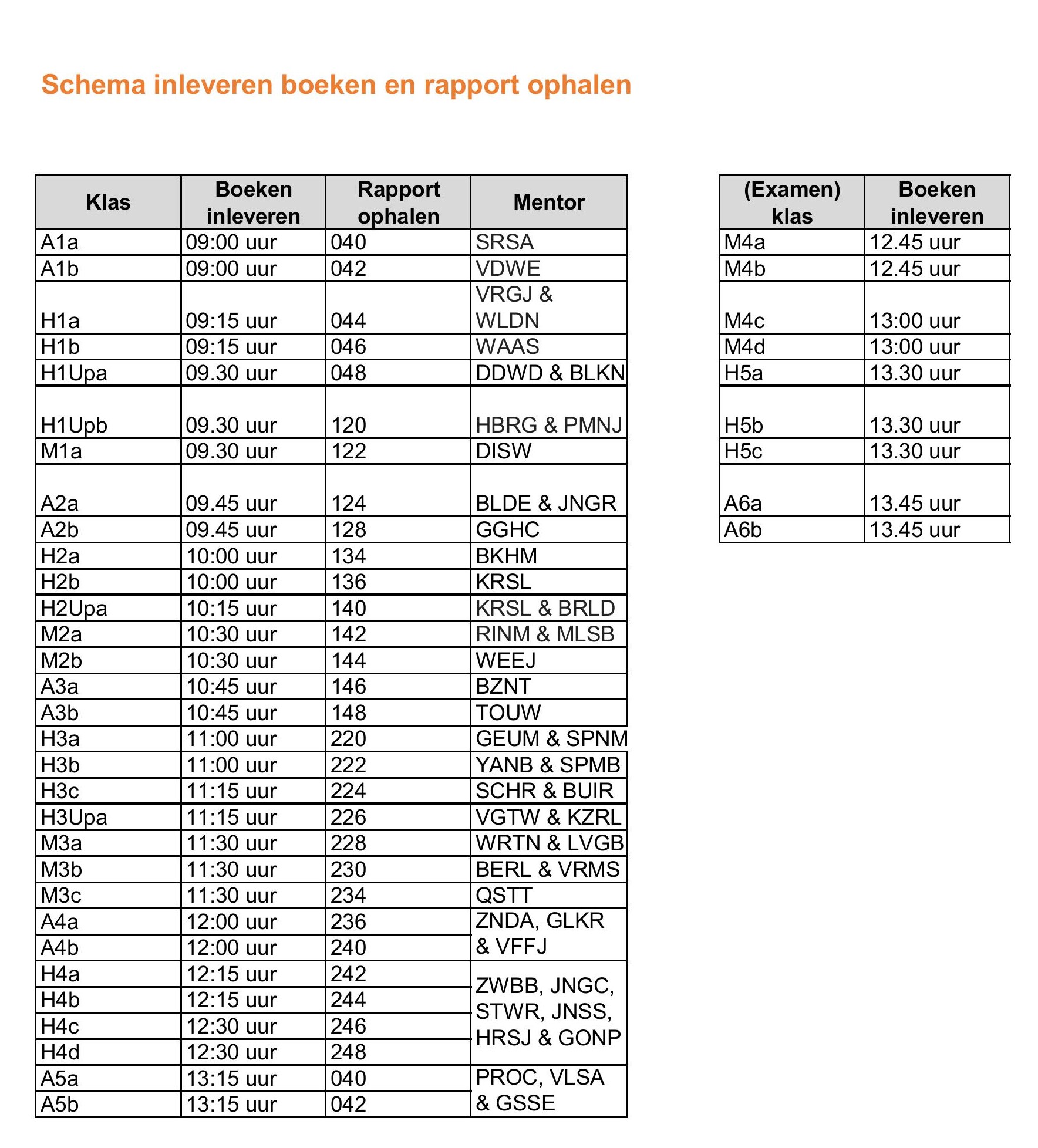 Op donderdag 17 juli 2025 zijn twee teams van VanDijk op school aanwezig om de schoolboeken in te nemen. Dit zal gebeuren in de aula. In de afbeelding staat de inlevertijd en de locatie per klas. Het is voor een vlotte afhandeling belangrijk de daarop genoemde tijd aan te houden! Na het inleveren van de boeken, haal je je rapport op bij de mentor. In welk lokaal staat ook op de afbeelding aangegeven.