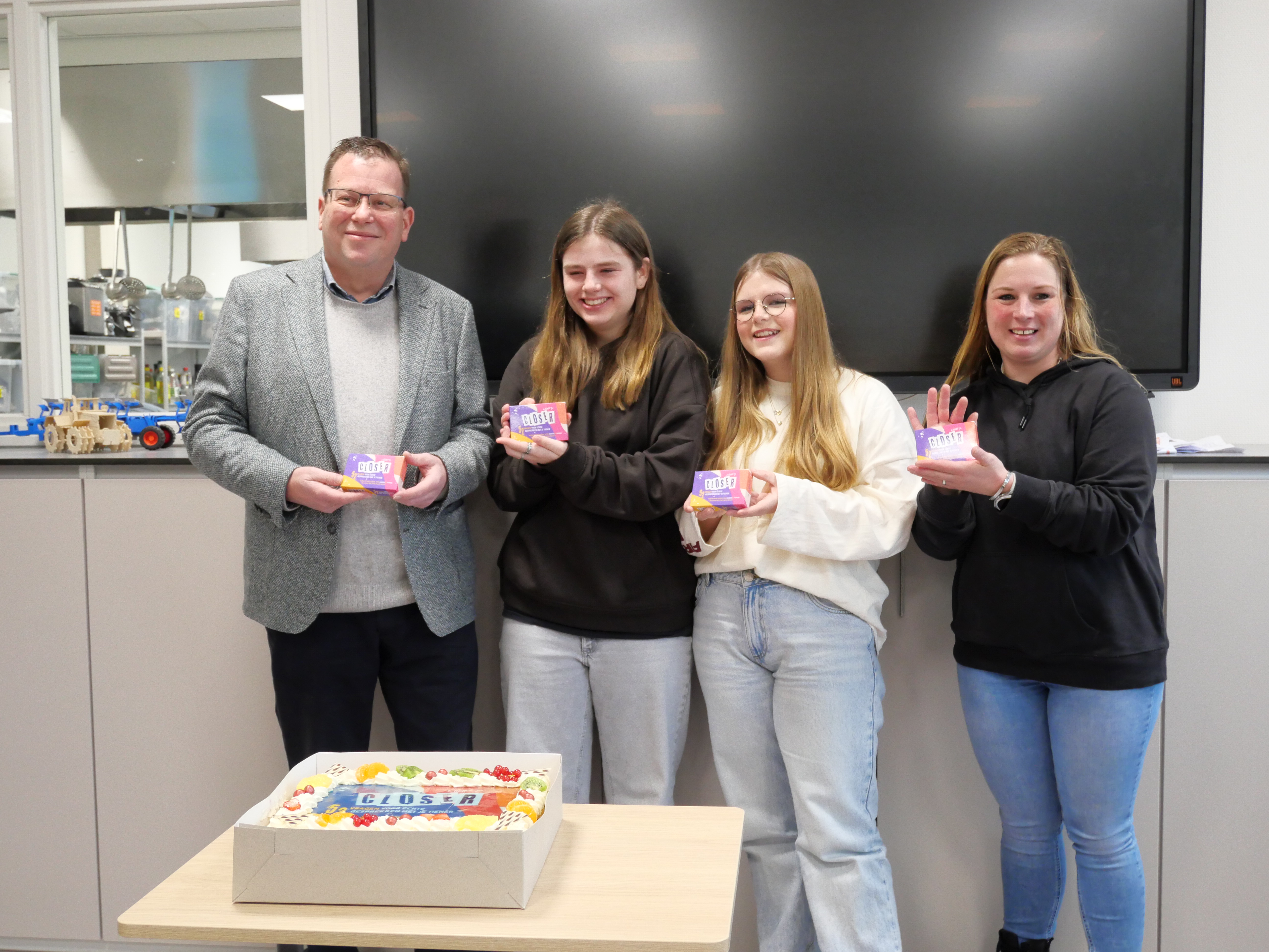 Hoe praat je als jongere met je ouders over lastige of kwetsbare onderwerpen? Leerlingen Nadine en Savanna van RGO Beroepscampus in Sommelsdijk bedachten hiervoor een praktische kaartenset genaamd ‘Closer’. De set helpt ouders en jongeren om makkelijker met elkaar in gesprek te gaan. Wethouder Berend Jan Bruggeman reikte op vrijdag 6 februari de eerste kaartenset uit in de klas, in aanwezigheid van de ouders van Nadine en Savanna en hun docent. Het feestelijke moment werd afgesloten met taart voor de hele klas.
